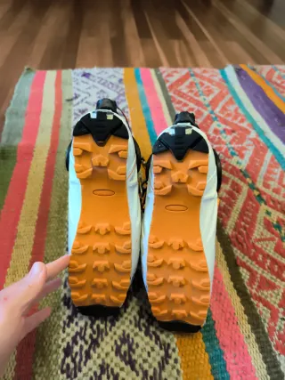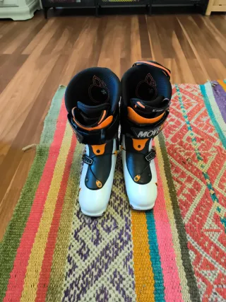 Botas de esquí de travesía de la marca Movement. Diseñadas para ofrecer rendimiento y comodidad en la montaña. - Color blanco y negro con detalles en naranja. - Cierres de hebilla ajustables. - Interior acolchado para mayor confort.Botines desgastados pero comodos