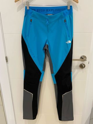 Pantalones de esquí y travesía The North Face con un diseño moderno y funcional. - Color azul vibrante con paneles en negro y gris. - Cintura elástica con cordón. - Cremalleras en los bolsillos laterales. - Logo de The North Face en la pierna derecha. - Inscripción NEVER STOP EXPLORING en la cintura.