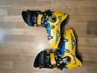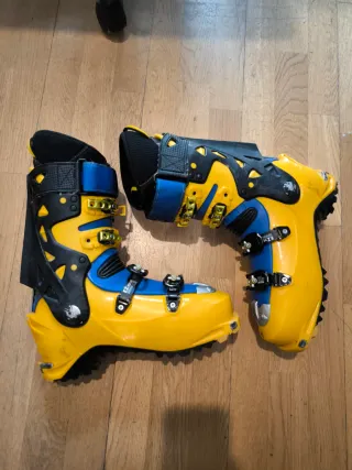 Botas de esquí de travesía La Sportiva Sideral 2.0 en color azul y amarillo. Talla 29 Muy ligeras El cierre de velcro está un poco descosido pero se puede arreglar sin problema. Ver última foto