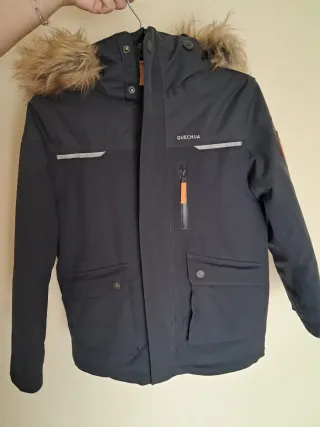 Chaqueta de montaña Quechua para niño, ideal para actividades al aire libre. Chaqueta travesía. Para 8 a 9 años. Impermeable forro interior caliente. - Color negro. - Capucha con pelo sintético. - Cierre de cremallera. - Bolsillos frontales con solapa. - Detalles reflectantes.