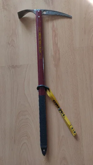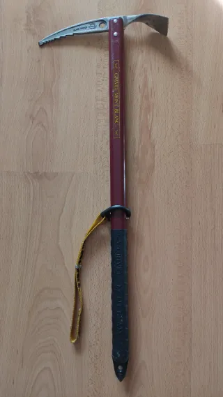 Un piolet clásico, ideal para travesías, alpinismo.. Etcc - Mango de color rojo. - Correa de sujeción roja.