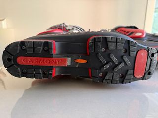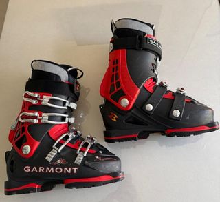 Botas de esquí Garmont Endorphin, diseñadas para ser mixtas, combinando características para esquí alpino y de travesía. Botas Garmont Endorphin mixtas (alpino/travesía) talla 27, longitud de suela 306mm. Muy poco uso, prácticamente nuevas. - Color principal negro con detalles en rojo. - Cierres de hebilla metálica. - Correa superior de velcro para ajuste adicional.