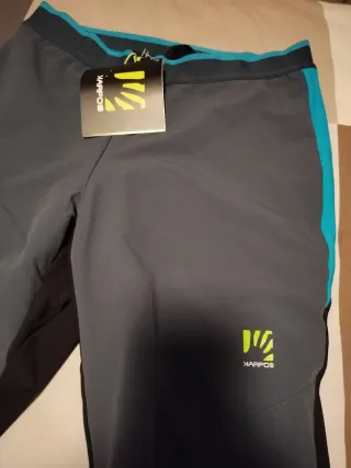 Pantalón técnico Karpos para hombre, modelo Gran Mont. Diseñado para actividades de montaña. Talla xl - Color gris oscuro con detalles en azul turquesa. - Paneles laterales en negro. - Zona inferior de las perneras en negro. - Cremalleras de los bolsillos en azul turquesa. - Cintura elástica con cordón de ajuste.