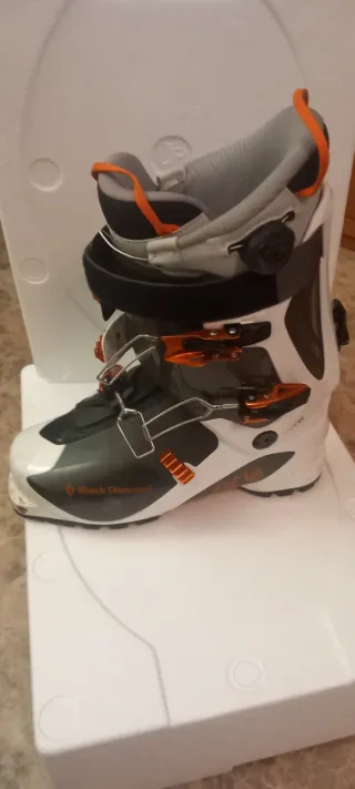 Botas de esquí de travesía de la marca Black Diamond. - Talla 43. - Color blanco, negro y naranja. - Cierres de hebilla y velcro.