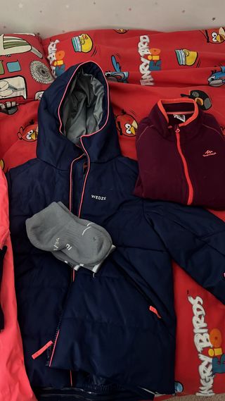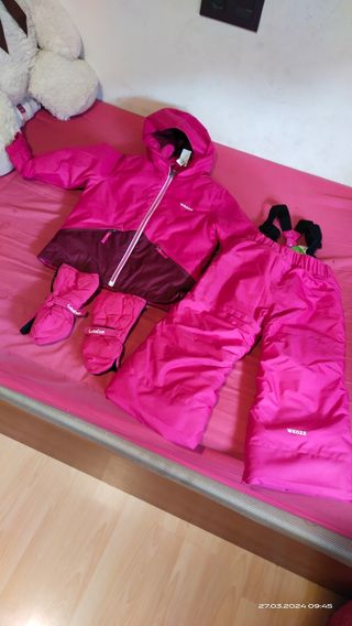 Todo tiene un sólo uso. Quizás necesite un lavado, pero está en perfecto estado. Botas de nieve Quechua Color azul marino con detalles en rojo. Forro interior de pelo sintético. Cierre con cordones. Impermeables. Talla 33-34. Con sus correspondientes medias, color gris. Pantalones, chaqueta y guantes marca Wedze, color rosa y azul marino. Impermeables y térmicos. Polar marca Quechua, color granate, camiseta interior oscura y leggings interiores oscuros para debajo de los pantalones y el polar y no pasar frío. Todo está en perfecto estado, tiene un sólo uso. Oportunidad.
