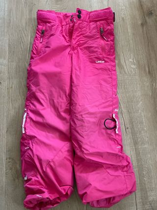 Pantalón de nieve para niña de la marca Decathlon, talla 6. Color rosa. - Cierre con botones y cremallera. - Bolsillo lateral con botón. - Cintura ajustable con velcro.