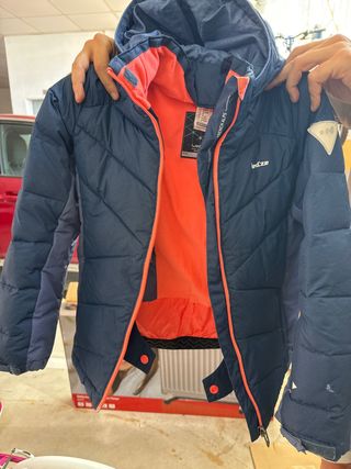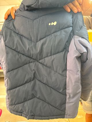 Abrigo de nieve de Decathlon en color azul, talla 8 años. - Diseño acolchado. - Forro interior salmón. - Cierre de cremallera. - Bolsillo para el forfait Tiene un pequeño enganchón en la manga izquierda como se ve en la foto