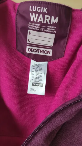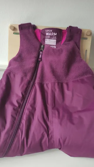 Peto de nieve para niño/a de la marca LUGIK WARM (Decathlon). Ideal para mantener el calor en los días fríos. - Color morado. - Tejido exterior impermeable. - Forro interior de pelo suave. - Cremallera frontal. El peto tiene una prolongación de goma en el tirante pero no se ha llegado a estrenar.