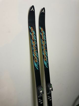 Esquís vintage de la marca Dynastar con tecnología Kevlar. Un clásico para los amantes del esquí. - Diseño negro con detalles en naranja y turquesa. - Fijaciones incluidas.