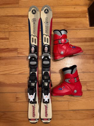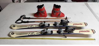 Conjunto de esquí para niños Dynastar D8. - Esquís con fijaciones. - Botas de esquí rojas. - Bastones de esquí.