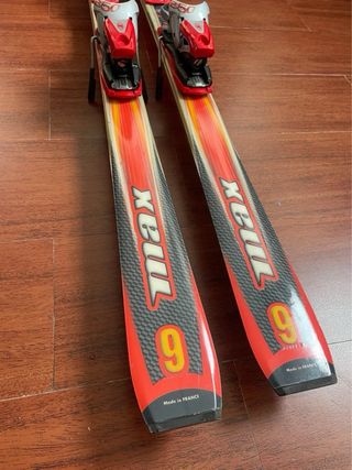 Esquís Dynastar Max 9 con fijaciones Marker M 1000. - Diseño deportivo en rojo, blanco y amarillo. - Detalle de número 9 en la punta. - Fabricados en Francia.