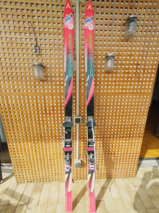 Esquís de travesía vintage marca Dynastar. Perfectos para usar de decoración o incluso usarse en nieve. Tienen alguna marca de uso por los años pero siguen siendo totalmente funcionales - Diseño en color rosa y negro. - Detalle de logo 'Dynoastar Extreme' en verde. - Fijaciones Dynastar. - Modelo 'Radical Kevlar'.