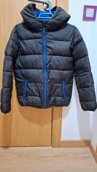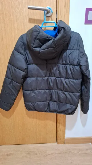 Cazadora de plumas para niño o niña, ideal para el frío. 10-12 años. Está en muy buenas condiciones, con poco uso. Tiene los puños un poco desgastados, ver fotos, de ahí el precio - Color exterior gris oscuro. - Forro interior azul. - Cremallera frontal azul. - Dos bolsillos laterales con cremallera azul.