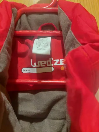 Anorak de esqui juvenil de Wedze. Talla 12 años. Con capucha oculta en el cuello. Le falta el velcro de cierre para la capucha recogida, pero sin el, la capucha tambien se sujera recogida y no se cae.