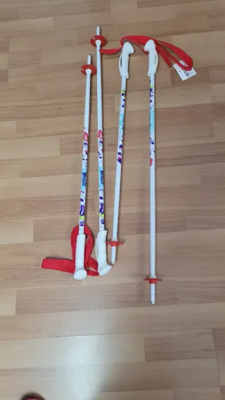Conjunto de bastones de esquí para niños. Tienen un diseño divertido y colorido. - Mangos blancos ergonómicos. - Correas rojas ajustables. - Diseño con dibujos animados y texto 'Mezze'.