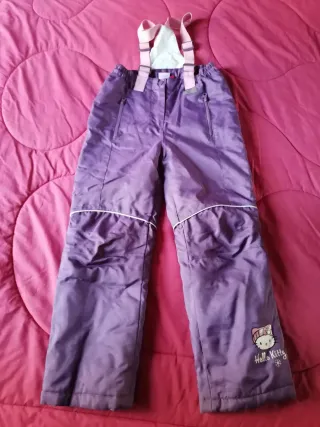 Pantalón de nieve para niños con tirantes y un divertido diseño de Hello Kitty. - Color morado. - Tirantes ajustables. - Bolsillos con cremallera. - Estampado de Hello Kitty en la pierna. Usados una sola vez