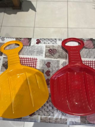 Set de dos trineos tipo pala para jugar en la nieve. Son de plástico resistente y ligeros. - Color amarillo. - Color rojo. - Marca EDA.