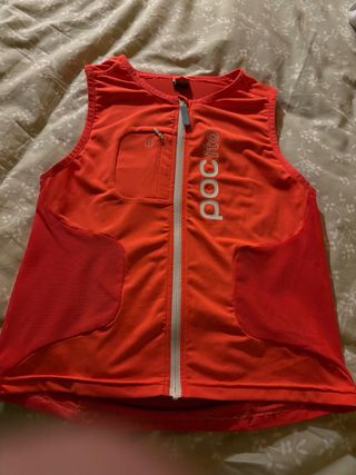 Chaleco de esquí infantil de la marca POCito, en talla L. Diseñado para ofrecer protección y visibilidad en la montaña. - Color naranja fluorescente. - Cremallera frontal completa. - Bolsillo con cremallera en el pecho. - Paneles laterales de malla. - Logo de POCito en el pecho.
