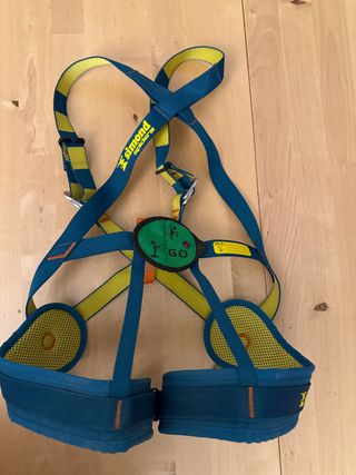 Arnés de escalada Simond en color azul y amarillo, diseñado para los más pequeños. - Marca: Simond - Color: Azul y amarillo - Cierre con hebillas ajustables - Acolchado en cintura y perneras