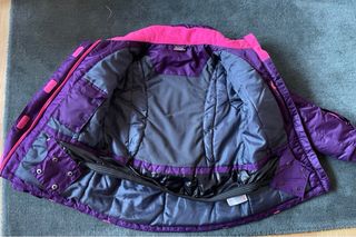 Buzo de una pieza para la nieve o esquí, ideal para mantener a los más pequeños abrigados y protegidos. - Color morado con detalles en lila y blanco. - Cintura elástica para un mejor ajuste. - Puños y tobillos elásticos.