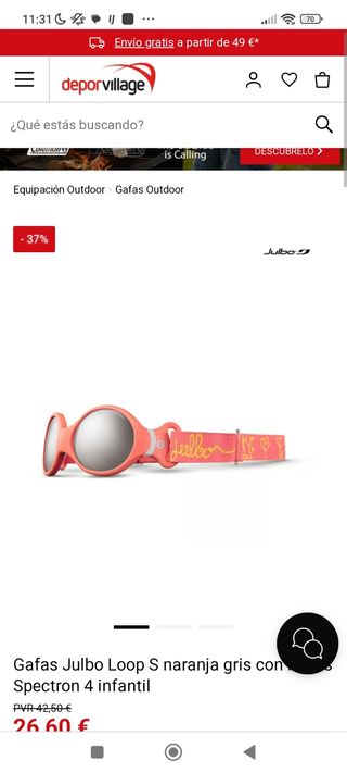 Usadas en dos ocasiones. Las gafas Julbo Loop S infantiles están diseñadas para proteger la vista de los más pequeños, de entre 0 y 18 meses, con una cobertura total de los ojos. Son muy ligeras, cómodas, con una solidez absoluta, además de contar con las lentes Spectron 4, que filtran a la perfección los rayos nocivos del sol. Julbo ha pensado también en los padres al dotarlas de una montura reversible y una nueva cinta regulable que permite ajustar perfectamente la montura al rostro.