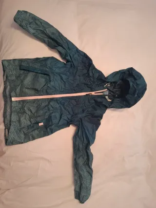Chubasquero de montaña y trekking para niños de la marca Quechua. - Diseño en color verde con estampado. - Cremallera frontal en color rosa. - Capucha integrada.