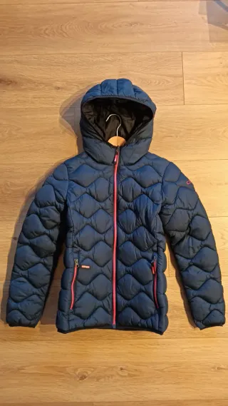 Chaqueta infantil de color azul, ideal para mantener el calor en actividades al aire libre, ski, montaña, senderismo, o también para calle. Water repellent Talla niño niña 1,52m 12 años - Diseño acolchado Feel Warm Flock, en copos de fibra sintética, garantiza calidez y transpirabilidad. - Abertura completa con cremallera, bolsillos laterales con cremallera. - Cinta elástica en puños, capucha y parte inferior de la chaqueta. - Capucha integrada. - Cremalleras termoselladas. Esquí, nieve, invierno, apreski