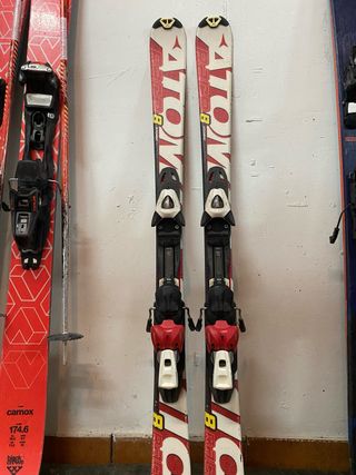 Esquís infantiles de la marca Atomic, ideales para jóvenes esquiadores. - Esquís con fijaciones. - Diseño en blanco y rojo.