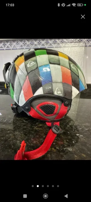Casco de esquí infantil con un diseño colorido y divertido de cuadros. Un casco para niños tiene que ser chulo, de lo contrario los enanos no se lo van a querer poner y va a haber movida. Talla XS (54 cm). Poquísimo uso.