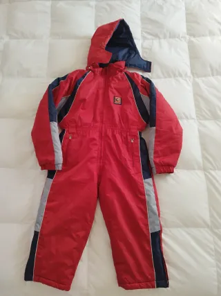 Conjunto de esquí para niñ@s en talla 3. Incluye chaqueta y pantalón. - Chaqueta de color rojo, blanco y azul marino. - Bolsillos frontales con solapa. - Capucha con forro interior de felpa turquesa. - Pantalón de color azul marino.Con velcro en la cintura para ajustar. -Con cremallera para unir la chaqueta al pantalón.