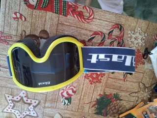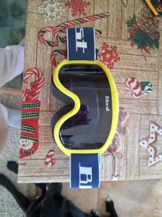 Gafas de esquí infantiles con montura amarilla y correa azul. - Lente oscura. - Correa con logo.