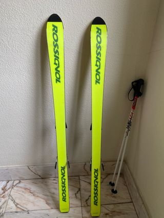 esquis infantiles 140 y bastones , suela y cantos sin rayonens , rayones superficiales en la parte superior, en perfecto estado para un niños qie esten empezando a esquiar. marca rossignol