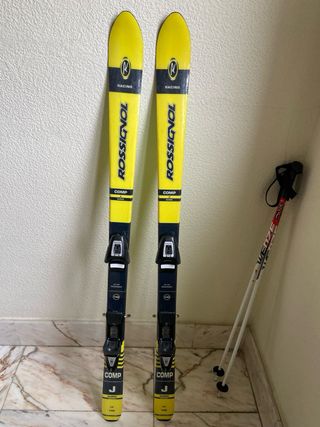 Conjunto de esquís infantiles Rossignol Comp SJ. Procedentes de cierre de tienda de montaña de San Isidro. Llevate unos esquís completos pormenos del precio de un día de alquiler Los negros de la derecha se venden a parte (10€)