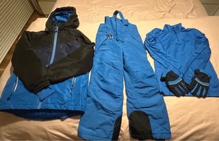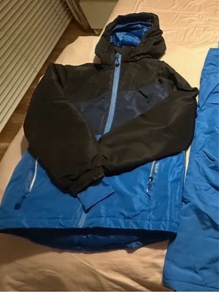 Conjunto de esquí infantil de dos piezas, ideal para días de nieve. Incluye chaqueta y pantalón. - Chaqueta con capucha, cremallera frontal y bolsillos. - Pantalón de tirantes con cremallera frontal. - Guantes a juego con detalles en azul y negro. - Prenda superior de manga larga azul con cremallera. - Diseño en color azul y negro.