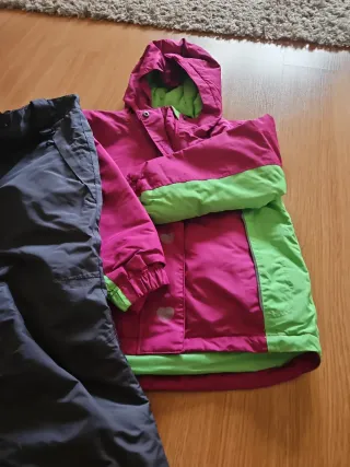 Conjunto de ropa de nieve para niños, ideal para disfrutar del invierno. - Chaqueta de color rosa y verde con capucha. - Pantalón de color gris oscuro con tirantes.