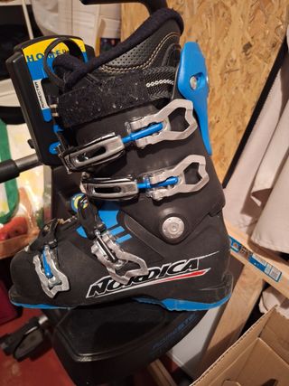 Botas de esquí de la marca Nórdica. Diseñadas para ofrecer comodidad y rendimiento en la montaña. - Cierres de hebilla ajustables. - Diseño en color negro con detalles azules. - Correa de velcro en la parte superior.