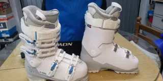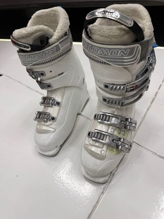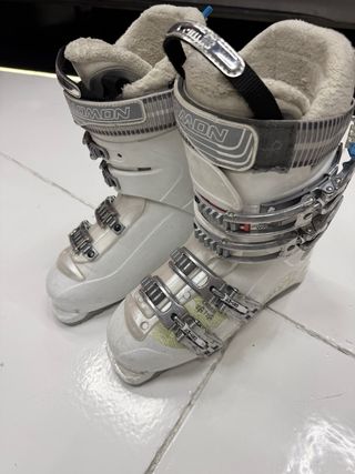 Botas de esquí Salomon para mujer, talla 25/25.5. Cuentan con sistema de calefacción. A pilas calor suave - Marca: Salomon - Talla: 25 / 25.5 - Color: Blanco - Cierres de hebilla ajustables metalicos con micro