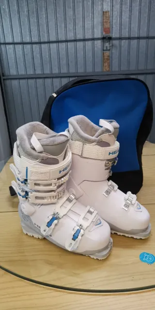 Botas de esquí HEAD para mujer, diseñadas para ofrecer comodidad y rendimiento en la pista. N°37. Regalo bolsa de transporte. - Color blanco y gris con detalles azules. - Cierres de hebilla ajustables. - Diseño ergonómico para un buen ajuste.