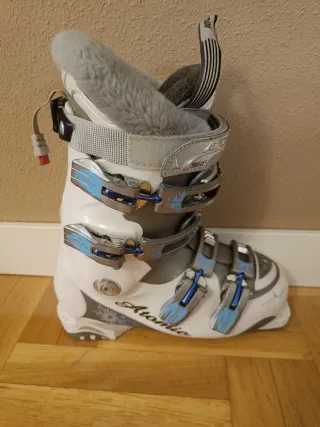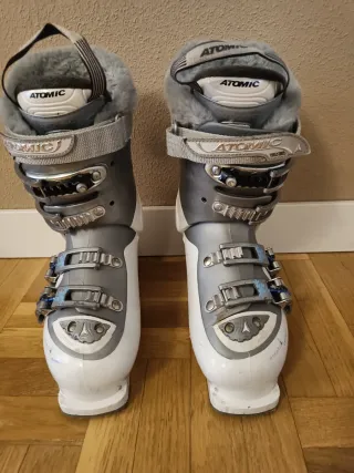 Botas de esquí Atomic con forro interior de pelo sintético. - Cierre con hebillas. - Diseño en color blanco y gris. - Marca Atomic visible en la lengüeta y el exterior. Talla 24,5-25 Largo de la suela 294mm.