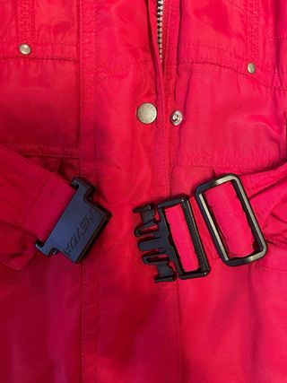 Chaqueta de esquí de color rojo, diseñada para mujer. Cuenta con un cinturón ajustable para un mejor ajuste. talla 42 mujer - Cierre de botones y cremallera. - Cuello alto. - Puños elásticos. bolsillo interno.