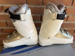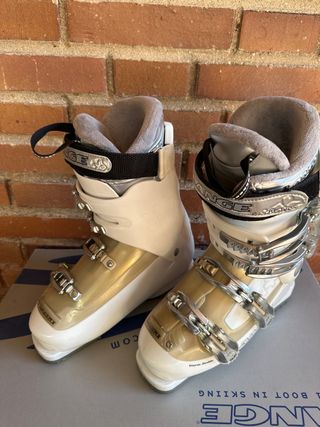 Botas de esquí Lange modelo Venus 75 para mujer talla 24 (para talla 38). Usado 10 veces solamente. Diseñadas para ofrecer comodidad y rendimiento en la pista. - Cierre con 4 ganchos metálicos. - Correa de velcro en la parte superior. - Diseño en blanco y dorado. - Interior gris mullido y forrado con material termico.