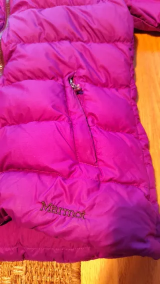 Chaqueta de plumas Marmot en color morado. Talla M para mujer. Pumas de 700 cuin 85-15%. En buen estado aunque con pequeños signos de uso. Perfecto como plumas de batalla para salir al monte. - Cierre de cremallera frontal. - Capucha ajustable. - Bolsillos laterales con cremallera.
