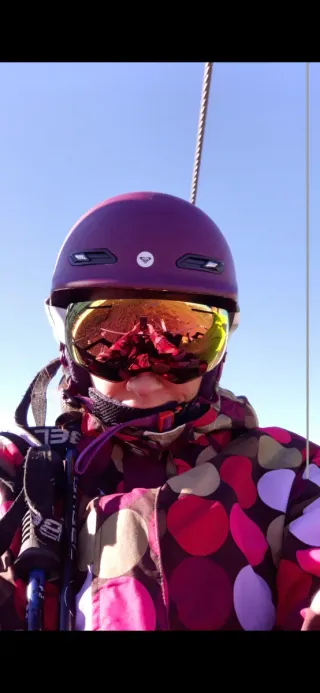 Conjunto de esquí para mujer. - Chaqueta Roxy con estampado de círculos en tonos morados, rosas y dorados. Talla L - Pantalones Wed'ze de esquí morados. Talla M - Casco morado Roxy (54cm) - REGALO LAS GAFAS