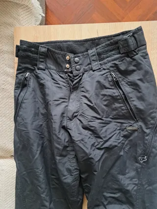 Pantalón de esquí para mujer en color negro, talla 42. Cremalleras en los bolsillos laterales y en los bajos de las perneras. Tejido resistente y muy cálido. Tiene muy poco uso.