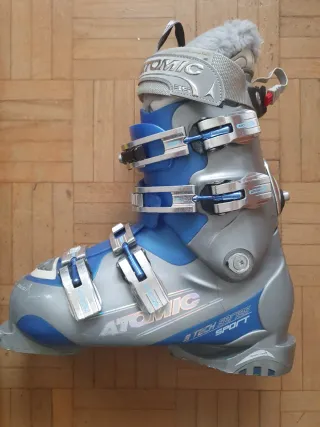Conjunto de botas de esquí Atomic y bastones de la marca Head. - Botas de esquí plateadas y azules con cierres ajustables. Talla 25.5-26 más o menos un 40 de pie. - Bastones de esquí amarillos con empuñaduras negras de 115 cm.