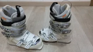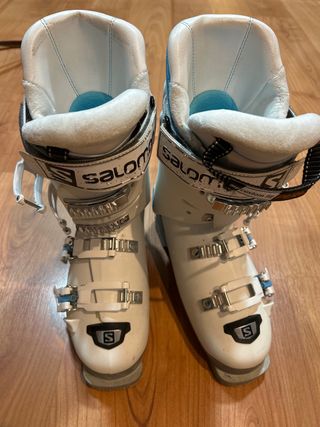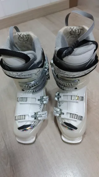 Botas de esquí Salomon para mujer en talla 24.5. Estan practicamente nuevas como se puede ver en la fotos. Mi hija las gastó una semana y la siguiente temporada se le quedaron pequeñas. Son cómodas para nivel principiante e intermedio. - Color blanco. - Cierre con 4 ganchos. - Diseño X-Fit. - Posibilidad de poner accesorio de calefacción interior. - Marca de confianza. - Se conservan en su caja de embalaje original.