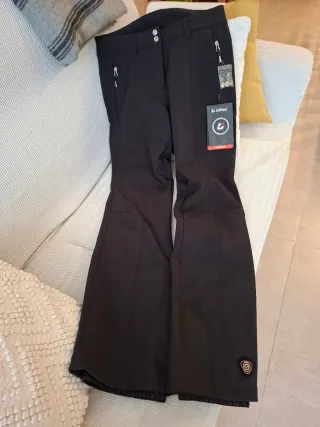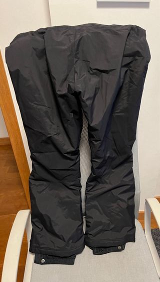 Pantalón de esquí negro para mujer, talla XL. Diseñado para ofrecer comodidad y protección en la montaña. - Tirantes ajustables. - Bolsillos frontales con cremallera impermeables. - Refuerzos en los bajos de las perneras. - Usado 3 días