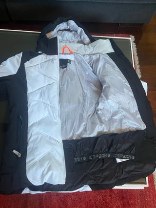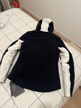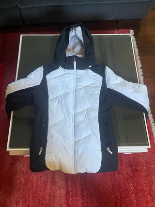 Chaqueta de esquí con diseño moderno en color negro y blanco. Perfecta para tus aventuras en la nieve. - Paneles acolchados en blanco. - Mangas y laterales en negro. - Capucha integrada. - Cremallera frontal completa. - Bolsillos laterales con cremallera. - Bolsillo en mangas con cremallera. - Talla 36 - Chaqueta que costo 165€ en muy buen estado