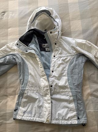 Chaqueta de esquí Columbia para mujer, con un diseño bicolor en blanco y azul claro. Ideal para actividades al aire libre. - Capucha integrada. - Cierre de cremallera y botones a presión. - Logo de Columbia en la parte frontal y trasera. Poco uso pero exterior desgastado por lavado en maquina. Para frio medio. Sin manchas. Cremalleras perfectas.