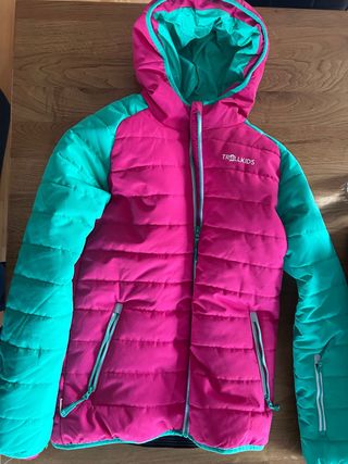 Abrigo TROLLKIDS de esquí, ideal para actividades al aire libre. Diseñado para una altura de 1,64 m. Para niña o mujer. Nuevo. Nada calienta más que un troll - Color fucsia y turquesa. - Capucha integrada. - Cremallera frontal. - Dos bolsillos laterales con cremallera.
